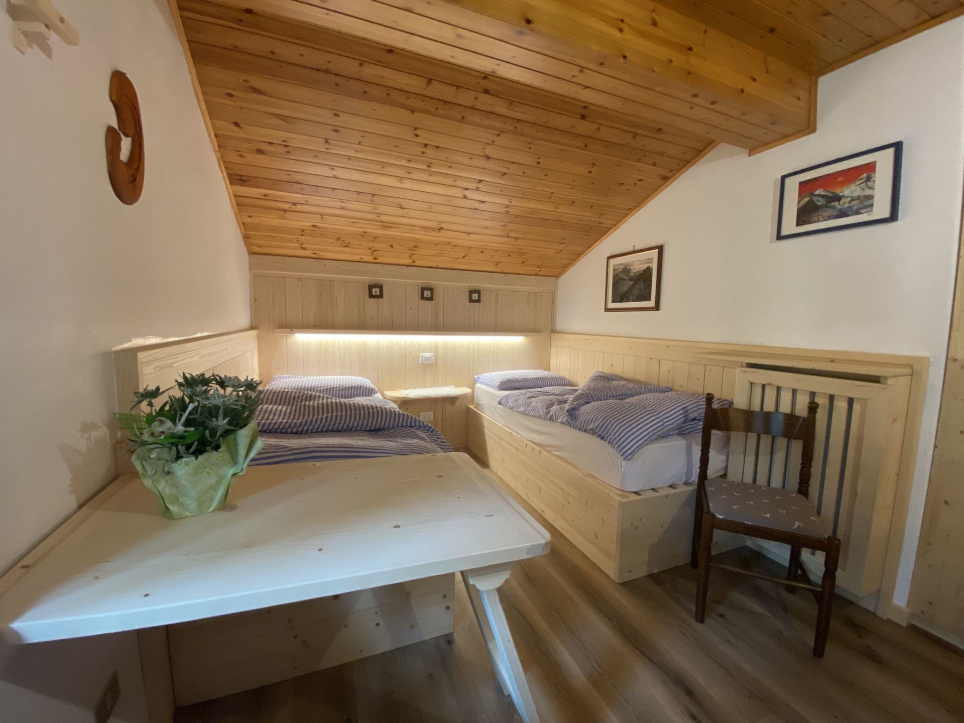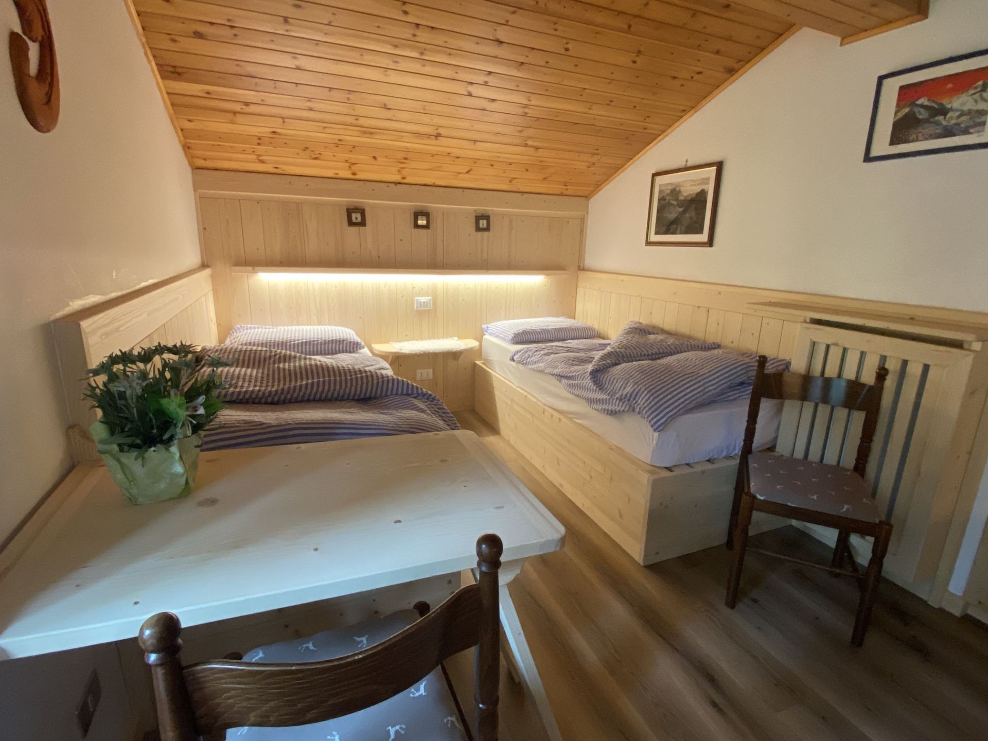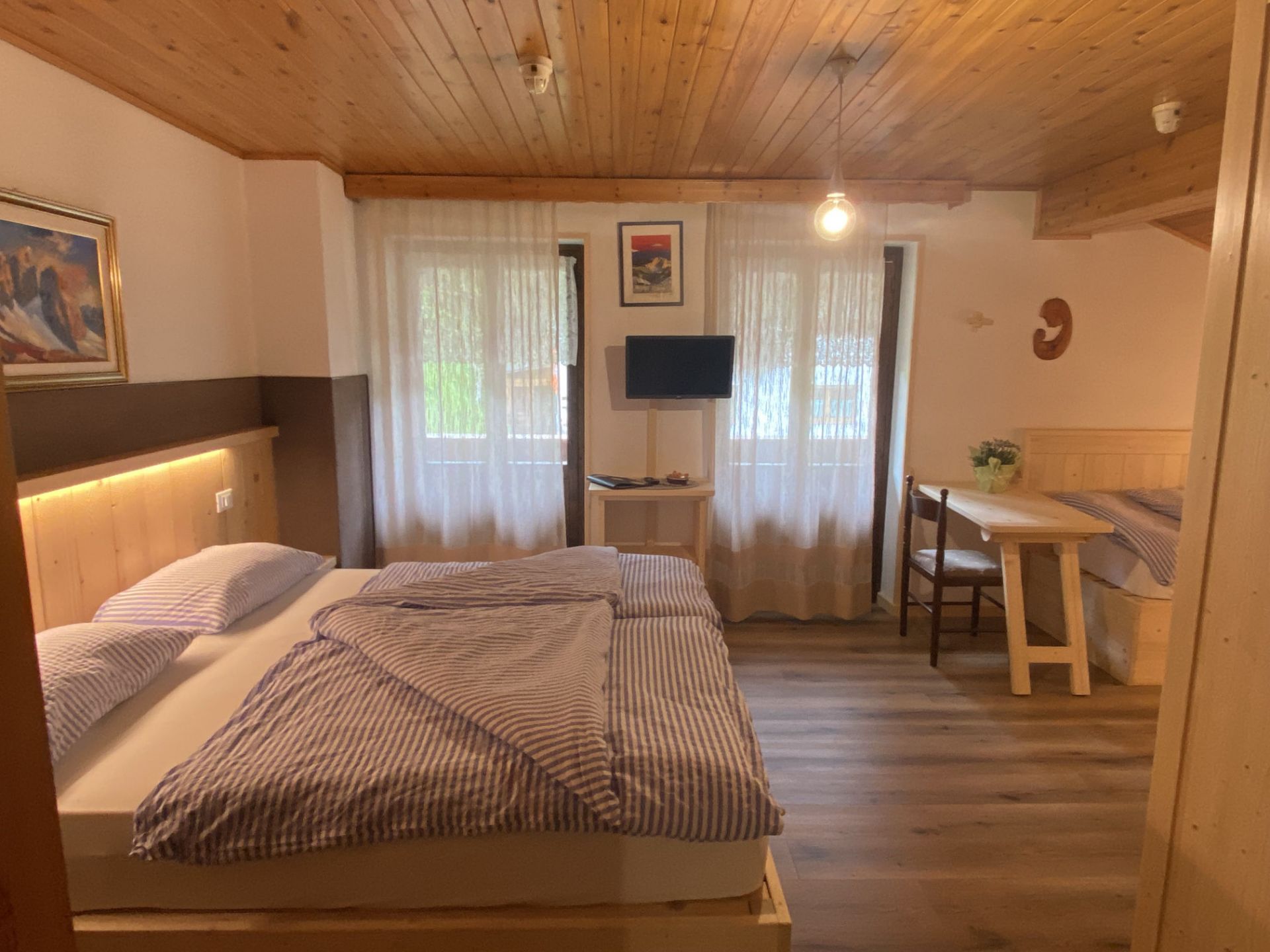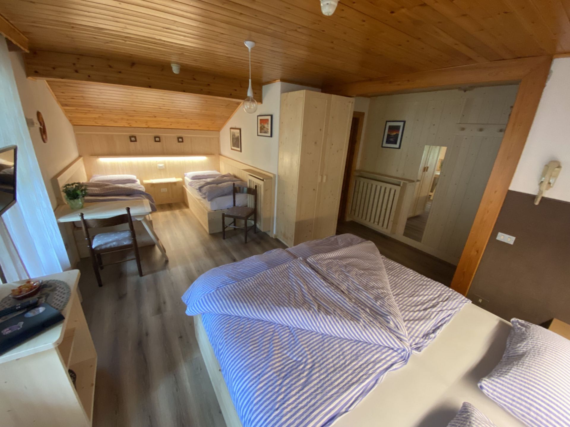 La nostra camera quadrupla si trova in mansarda ed è dotata di un ampio balcone. Potrai godere della meravigliosa vista dei Monti Piz del Corvo e Cernera che ti sembrerà di toccare nelle giornate più limpide, e che nelle serate soleggiate si tingono del classico colore rosa, tipico delle Dolomiti. È una camera ampia, dotata di letto matrimoniale e due comodi letti singoli, adatta a trascorrere una piacevole vacanza con la tua famiglia o con i tuoi amici. Dispone di bagno privato con vasca/doccia, TV a schermo piatto, scrivania e armadio. I letti sono preparati con piumoni singoli alla tedesca.