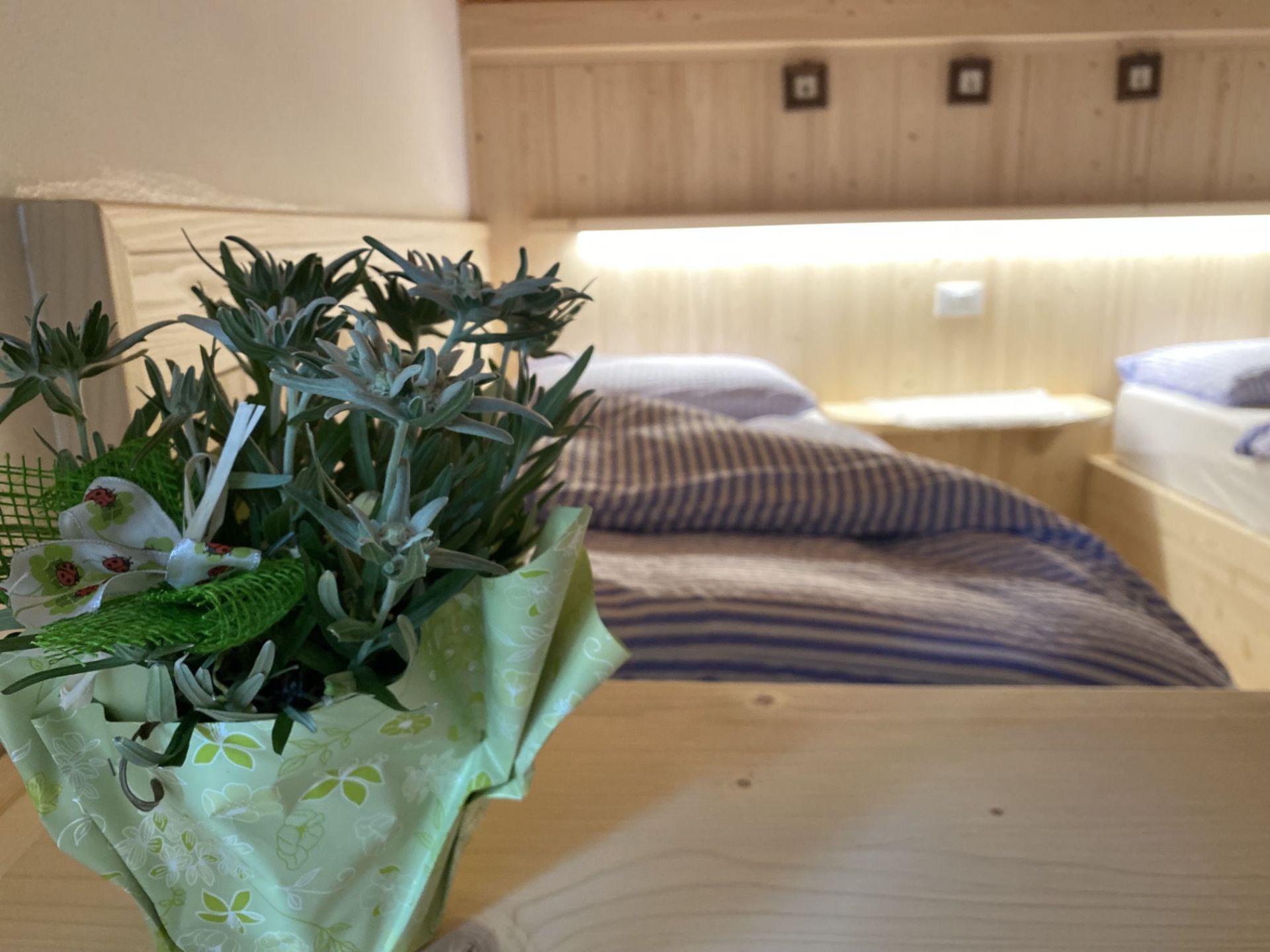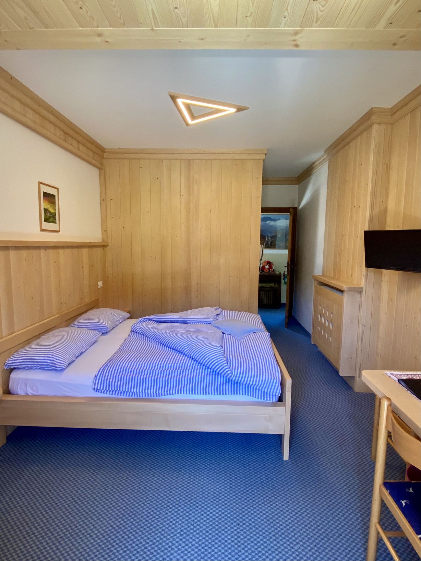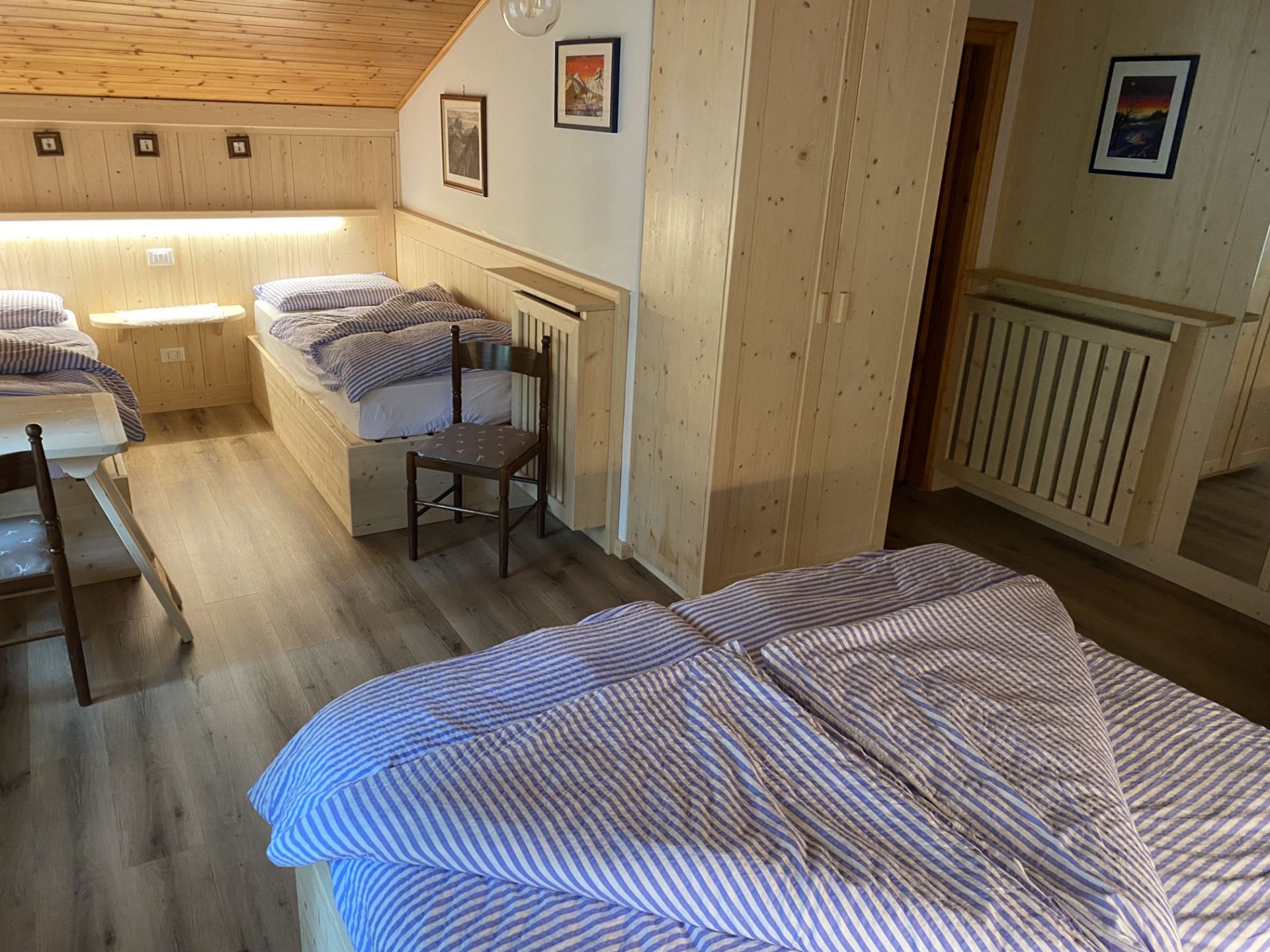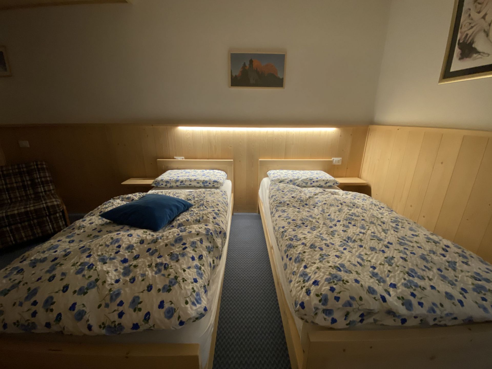 La nostra camera quadrupla si trova in mansarda ed è dotata di un ampio balcone. Potrai godere della meravigliosa vista dei Monti Piz del Corvo e Cernera che ti sembrerà di toccare nelle giornate più limpide, e che nelle serate soleggiate si tingono del classico colore rosa, tipico delle Dolomiti. È una camera ampia, dotata di letto matrimoniale e due comodi letti singoli, adatta a trascorrere una piacevole vacanza con la tua famiglia o con i tuoi amici. Dispone di bagno privato con vasca/doccia, TV a schermo piatto, scrivania e armadio. I letti sono preparati con piumoni singoli alla tedesca.
